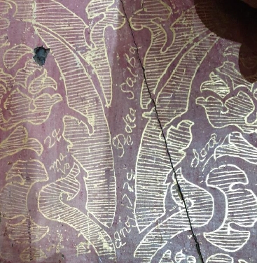 En la hornacina del lado de la Epístola, entre las líneas doradas de la decoración de estofado sobre fondo rojo, puede leerse una fecha y un nombre que dejan constancia de la autoría de esa restauración: